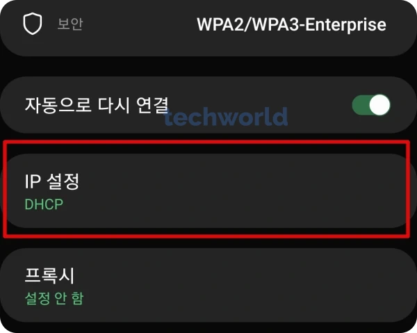 와이파이 설정 더 보기를 누르면 아래와 같이 IP 설정에 DHCP로 되어 있을텐데요. 이 부분을 눌러서 '고정'을 선택합니다.