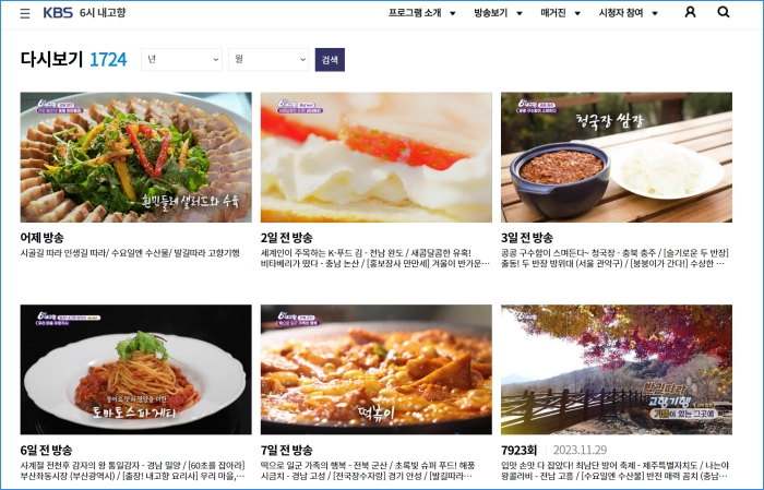6시 내고향 최근 방송부터 다시보기 할 수 있으며 연도와 월로 검색해서 다시보기 할 수도 있습니다.