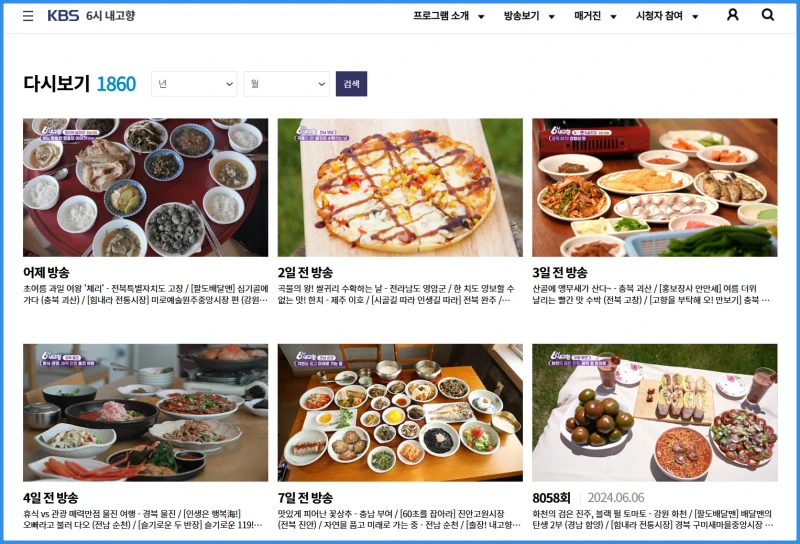 6시 내고향 다시보기는 최근 방송부터 할 수 있으며 연도와 월로 검색해서 다시보기 할 수도 있습니다.