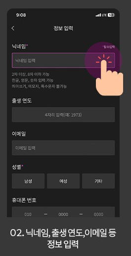 닉네임, 출생연도, 이메일, 성별, 휴대폰 번호 등 개인정보를 입력하고 수집에 동의합니다.